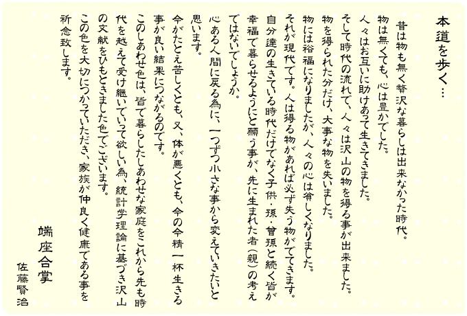 1980年に京都の大本山に修行に入り、現在も時間のある限り行に励んでいる。